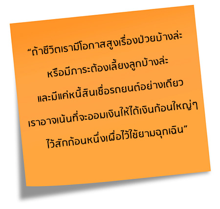 ดังนั้น โดยรวมแล้ว ถ้าเรามีหนี้บัตรเครดิต สินเชื่อเงินสด หรือเงินกู้นอกระบบเยอะ แต่ยังโสดและร่างกายโดยรวมแข็งเรง เราอาจเน้นที่การชำระหนี้พวกนี้ให้หมด หรือให้เหลือน้อยที่สุด แต่ถ้าชีวิตเรามีโอกาสสูงเรื่องป่วยบ้างล่ะ หรือมีภาระต้องเลี้ยงลูกบ้างล่ะ และมีแค่หนี้สินเชื่อรถยนต์อย่างเดียว เราอาจเน้นที่จะออมเงินให้ได้เงินก้อนใหญ่ๆ ไว้สักก้อนหนึ่งเผื่อไว้ใช้ยามฉุกเฉิน แต่ถ้าเรามีทั้งหนี้บัตรเครดิต หรือเงินกู้นอกระบบ แล้วก็เป็นคนป่วยบ่อย หรือมีลูกเล็ก เราควรต้องเน้นทั้งออมเงิน และชำระหนี้ไปพร้อมๆ กันเลยครับ