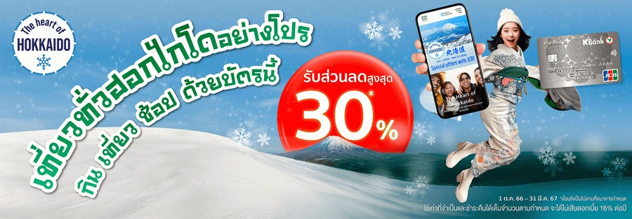 รายละเอียดโปรโมชั่น : เที่ยวทั่วฮอกไกโดอย่างโปร กิน เที่ยว ช้อปด้วยบัตรเครดิตเจซีบีกสิกรไทย รับส่วนลดสูงสุด 30% แค่รูดด้วยบัตรเจซีบีกสิกรไทย พร้อมโชว์หน้าแคมเปญ ณ ร้านค้าที่ร่วมรายการ รับ K Point K Point x2 ทุกการใช้จ่ายในญี่ปุ่น