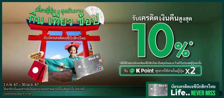 รายละเอียดโปรโมชัน : เที่ยวญี่ปุ่นต้องพกบัตรนี้ สนุกคุ้มทั้งกิน เที่ยว ช้อป กับบัตรเครดิตเจซีบีกสิกรไทย รับเครดิตเงินคืนสูงสุด 10% เมื่อมียอดใช้จ่ายเป็นสกุลเงินเยน ที่ร้านค้าในประเทศญี่ปุ่น พร้อมรับ K Point K Point x2 ทุกการใช้จ่ายในญี่ปุ่น