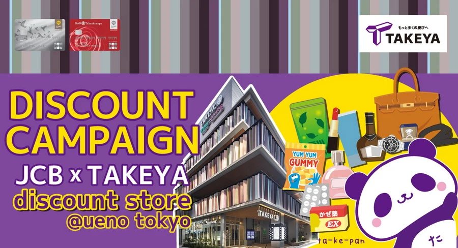รับส่วนลด 10%* เมื่อใช้จ่ายขั้นต่ำ 5,000 เยน/ เซลล์สลิป ส่วนลดสูงสุด 10,000 เยน เมื่อซื้อของด้วยบัตรเครดิต กรุงศรี เจซีบี หรือบัตรเครดิต สยาม ทาคาชิมายะ เจซีบี ที่ร้าน Takeya ที่ประเทศญี่ปุ่น