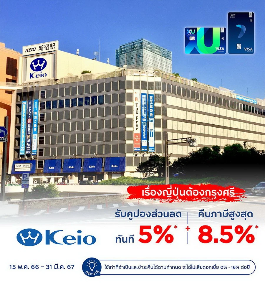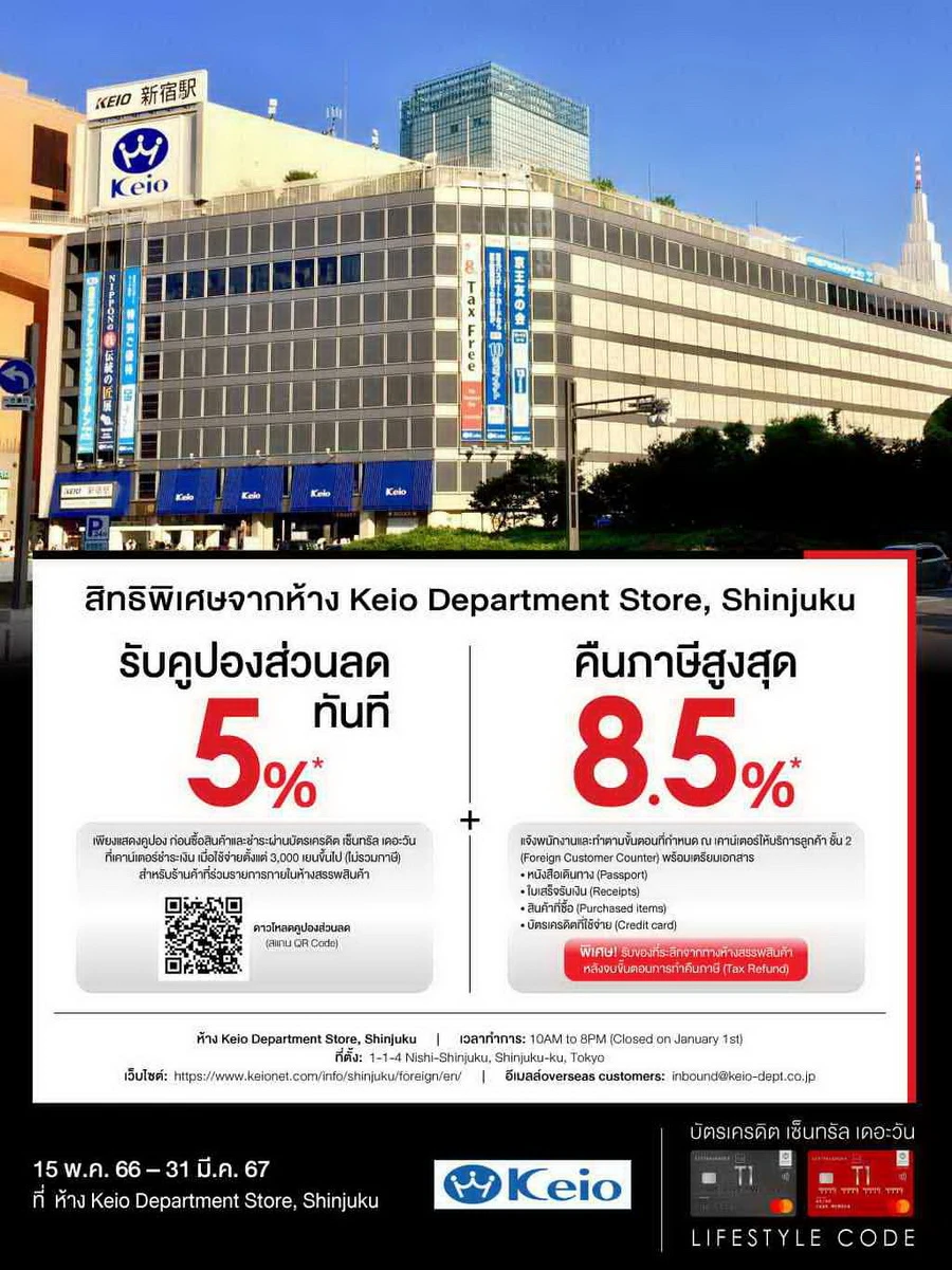 รายละเอียดโปรโมชัน : รับดีลสุดคุ้มจากห้าง Keio Department Store, Shinjuku สิทธิพิเศษสำหรับบัตรเครดิตกรุงศรีเฟิร์สช้อยส์ วีซ่า แพลทินัม และเอ็กซ์ยู บัตรเครดิต ดิจิทัล รับคูปองส่วนลดทันที 5%* + คืนภาษีสูงสุด 8.5%*