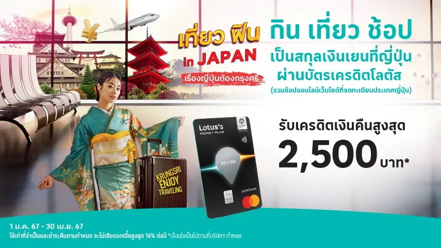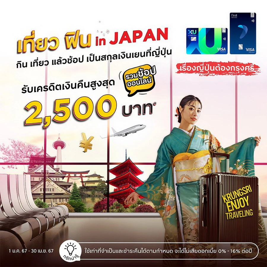 รายละเอียดโปรโมชัน : เที่ยวฟิน in JAPAN รับเครดิตเงินคืนสูงสุด 2,500 บาท* เพียงมียอดใช้จ่ายสะสมเป็นสกุลเงินเยน รวมช้อปออนไลน์ (เว็บไซต์ที่จดทะเบียนประเทศญี่ปุ่น) ผ่านบัตรเครดิตกรุงศรีเฟิร์สช้อยส์ วีซ่า แพลทินัม และเอ็กซ์ยู บัตรเครดิต ดิจิทัล ตามเงื่อนไข