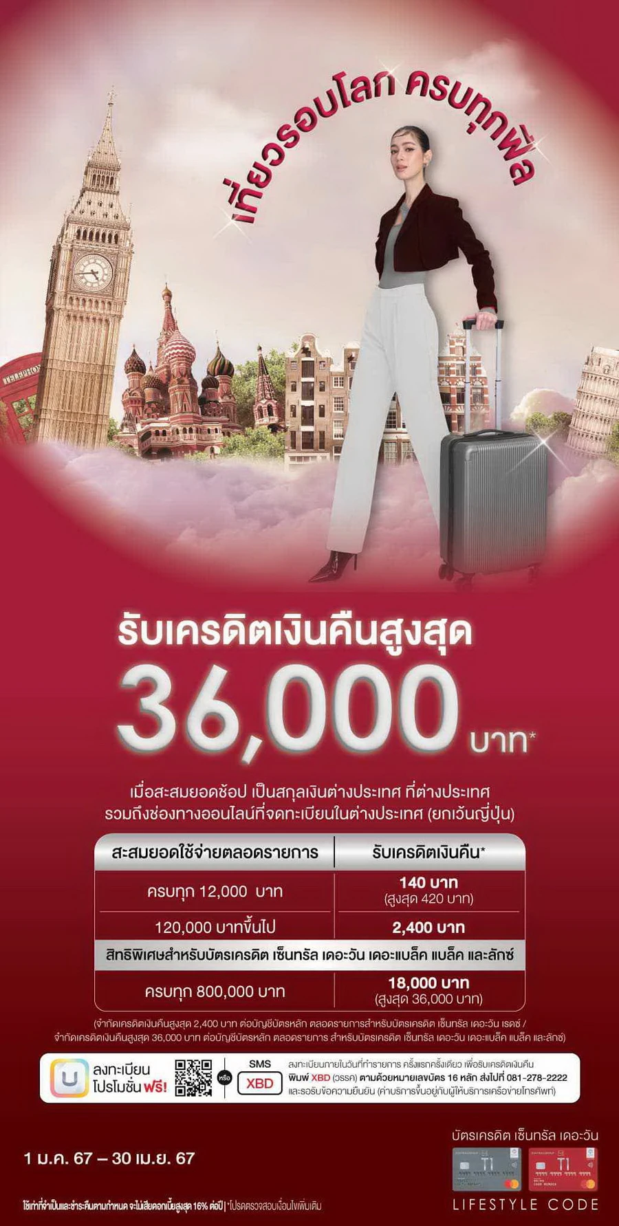 รายละเอียดโปรโมชัน : รับเครดิตเงินคืนสูงสุด 36,000 บาท* เมื่อสะสมยอดช้อป เป็นสกุลเงินต่างประเทศ ที่ต่างประเทศ รวมถึงช่องทางออนไลน์ที่จดทะเบียนในต่างประเทศ