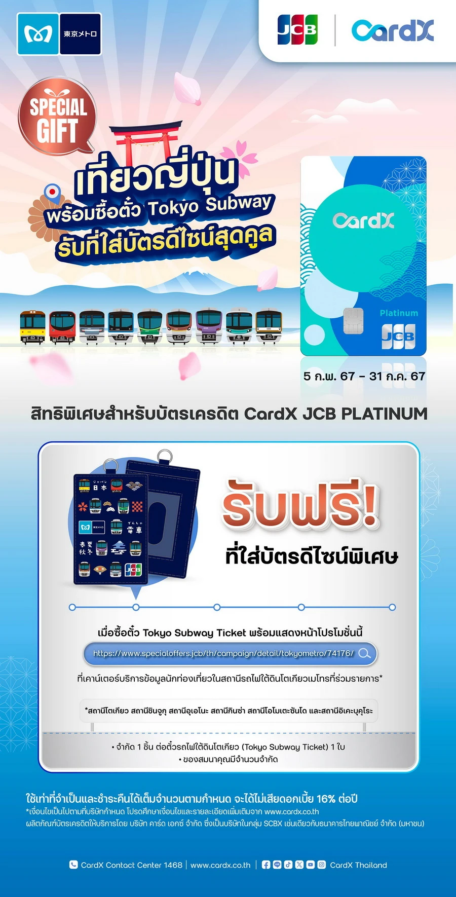 รายละเอียดโปรโมชัน : รับที่ใส่บัตรดีไซน์พิเศษ เมื่อซื้อตั๋ว Tokyo Subway Ticket ผ่านบัตรเครดิต CardX JCB PLATINUM ณ สถานีที่ร่วมรายการ