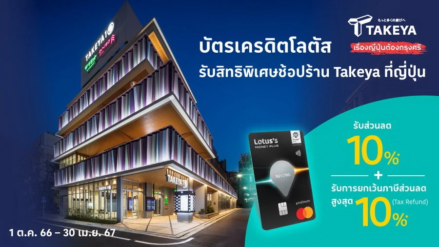 ต่อที่ 1: รับส่วนลด 10%* + รับการยกเว้นภาษีส่วนลดสูงสุด 10%* (Tax Refund) เมื่อใช้จ่ายขั้นต่ำ 5,000 เยน ส่วนลดสูงสุด 10,000 เยน ที่ร้าน Takeya ประเทศญี่ปุ่น ชำระผ่านบัตรเครดิตโลตัส