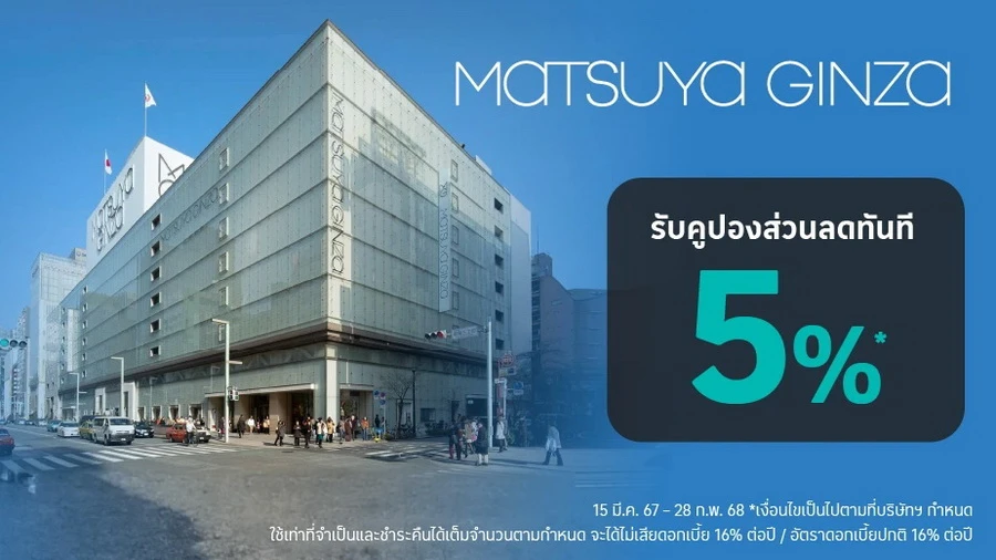 รายละเอียดโปรโมชัน : ช้อปที่ห้าง Matsuya Ginza รับคูปองส่วนลดทันที 5%* เพียงแสดงคูปอง ก่อนซื้อสินค้าและชำระผ่านบัตรเครดิต โลตัส ที่เคาน์เตอร์ชำระเงิน สำหร้บร้านค้าที่ร่วมรายการภายในห้างสรรพสินค้า หากสินค้าเข้าเงื่อนไขการขอคืนภาษี จะได้คืนภาษี (มีค่าบริการคืนภาษี 1.54%)