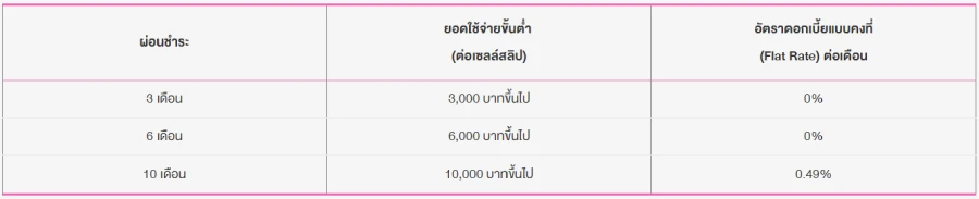 สำหรับยอดใช้จ่ายที่ร้านค้าเรียกเก็บแล้วเท่านั้น และยอดใช้จ่ายที่ขอใช้บริการผ่อนชำระรายเดือนต้องมียอดไม่ต่ำกว่า 3,000 บาท/เซลล์สลิป เมื่อคำนวณยอดผ่อนชำระรายเดือนต้องไม่ต่ำกว่า 1,000 บาทต่อเดือน สะสมครบตามขั้นต่ำที่กำหนดสามารเลือกผ่อนชำระรายเดือน ดังนี้