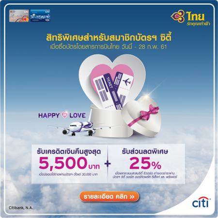 รายละเอียดโปรโมชั่น : Happy in Love สิทธิพิเศษสำหรับสมาชิกบัตรเครดิตซิตี้ เมื่อซื้อตั๋วโดยสารการบินไทย