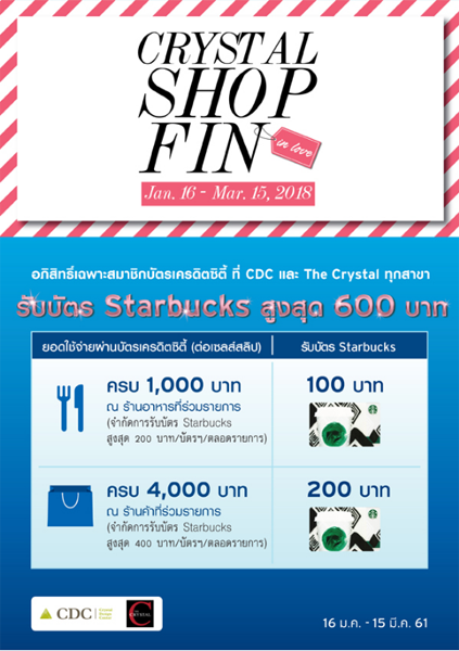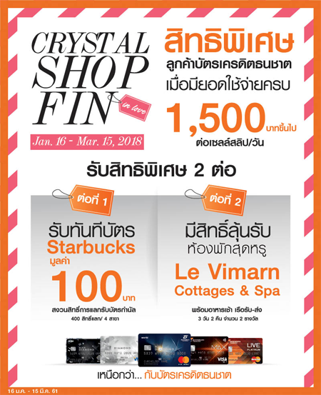 รายละเอียดโปรโมชั่น : Crystal Shop Fin สิทธิพิเศษสำหรับบัตรเครดิตธนชาต เมื่อมียอดใช้จ่ายครบ 1,500 บาทขึ้นไป รับ 2 ต่อ
