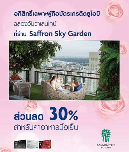 รายละเอียดโปรโมชั่น : อภิสิทธิ์เฉพาะผู้ถือบัตรเครดิตยูโอบี ฉลองวันวาเลนไทน์ ที่ร้าน Saffron Sky Garden โรงแรม Banyan Tree Bangkok