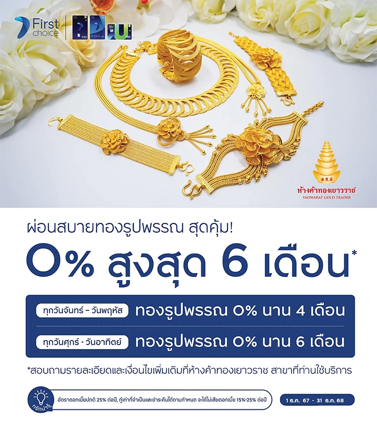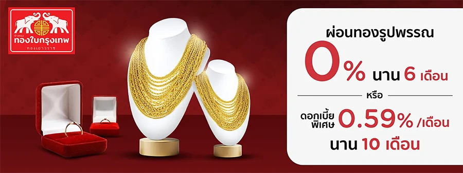 - แบ่งชำระทองรูปพรรณ หรือเครื่องประดับเพชร อัตราดอกเบี้ยพิเศษสำหรับลูกค้า 0.49% ต่อเดือน นาน 3, 4, 6 หรือ 10 เดือน