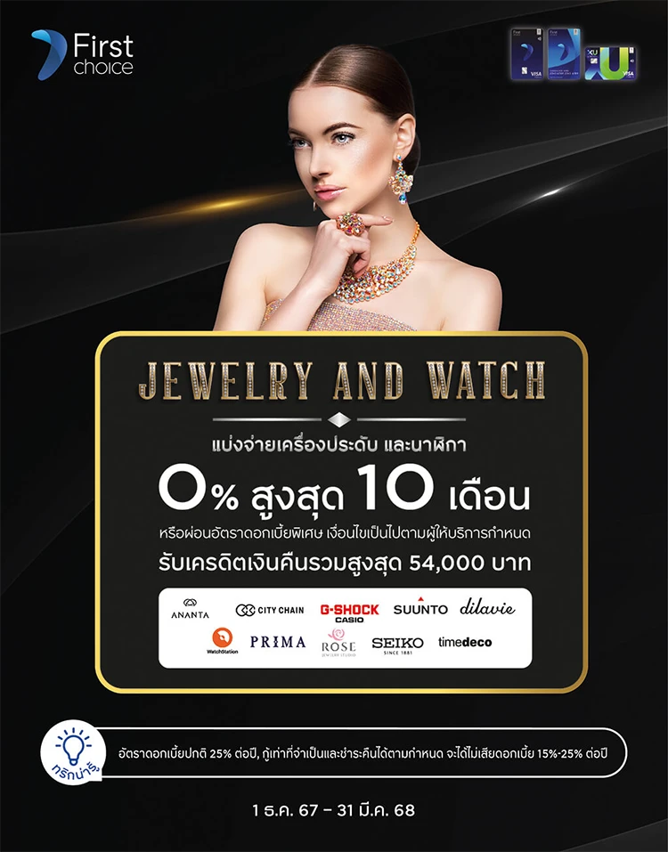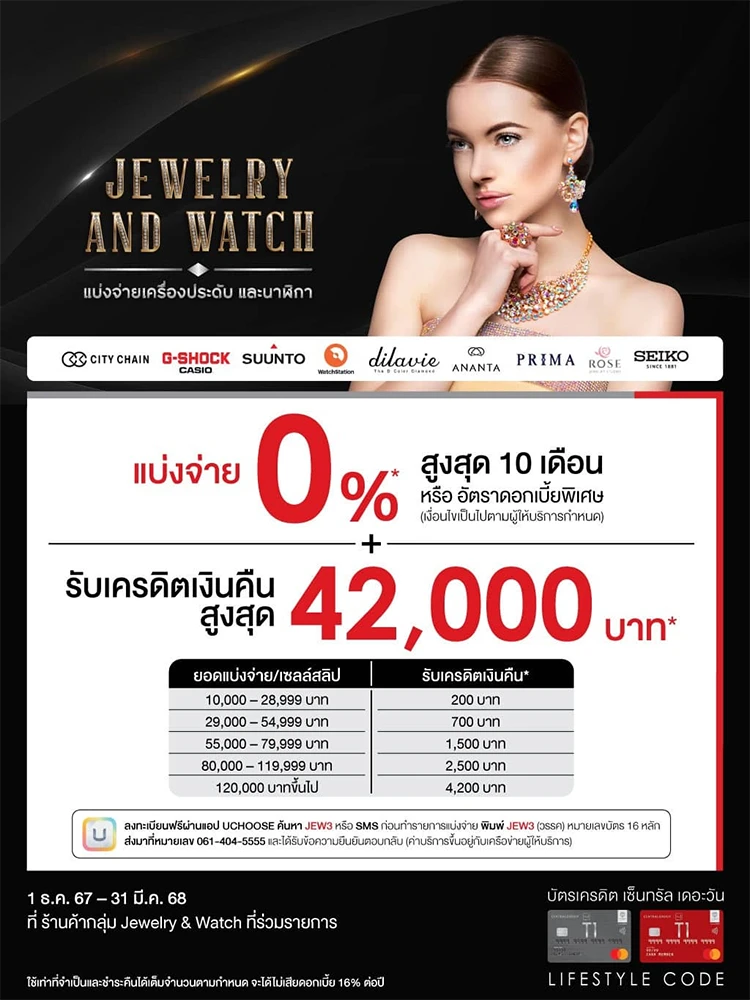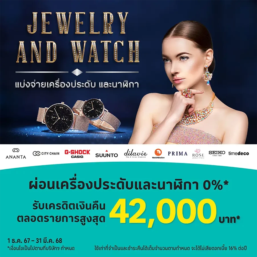 รายละเอียดโปรโมชัน : ผ่อนเครื่องประดับและนาฬิกา 0%* นานสูงสุด 10 เดือน ที่ร้านค้าที่ร่วมรายการ รับเครดิตเงินคืนสูงสุด 42,000 บาท*/หมายเลขบัญชีบัตรหลัก/ตลอดรายการ