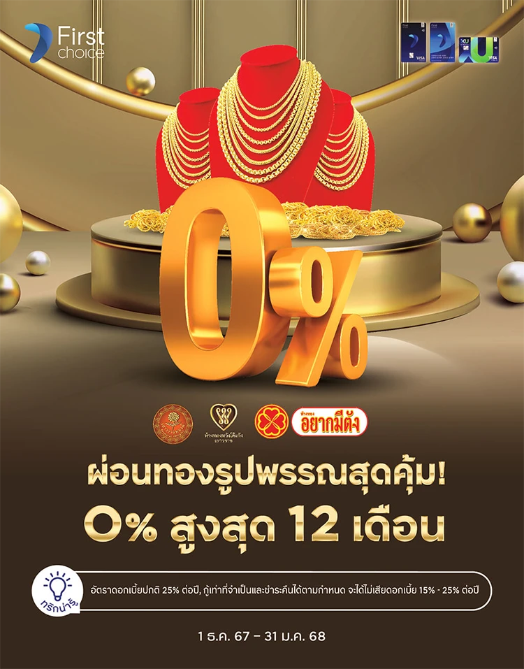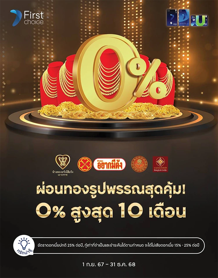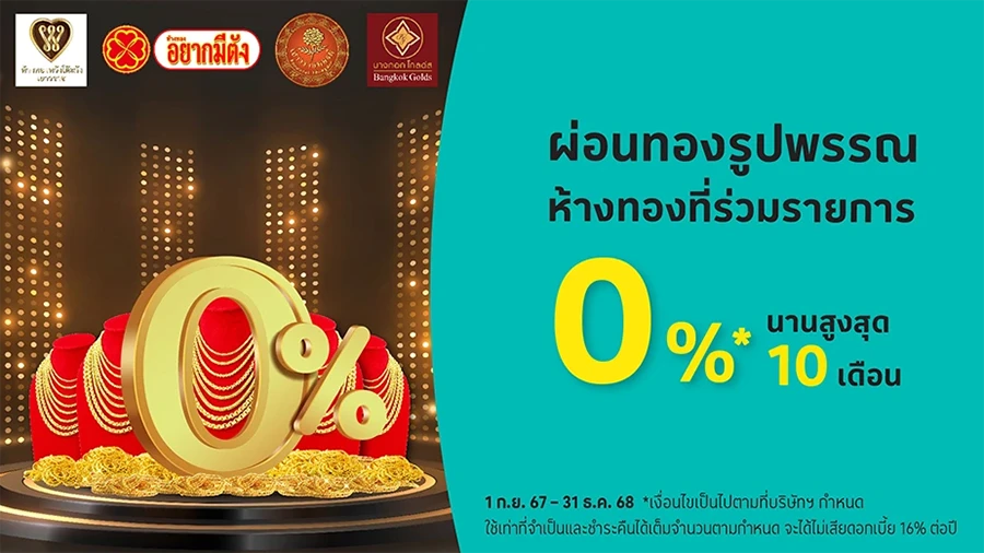 ช้อปทองรูปพรรณ หรือเครื่องประดับเพชร รับสิทธิ์แบ่งชำระดอกเบี้ย 0% นานสูงสุด 10 เดือน ในวันที่ร้านค้าจัดรายการส่งเสริมการขายแบ่งชำระดอกเบี้ย 0% ณ ห้างทองที่เข้าร่วมรายการ ดังนีh ห้างเพชรทองออโรร่า, ห้างทองบางกอก โกลด์ส, ห้างทองแม่ทองสุก, ห้างเพชรทอง โกลด์เด้น ไนน์ตี้ไนน์, ห้างเพชรทอง โกลด์มาร์ค เยาวราช, ห้างทองเยาวราชกรุงเทพ ห้างทองเยาวราช ห้างทองเยาวราชออมทอง ที่ร่วมรายการ, NGG ห้างเพชรทอง ง้วนเซ่งเฮงเยาวราช, ร้านเพชร ไดมอนด์ ฟอร์ ยู, ห้างทองหวังโต๊ะกังเยาวราช, ห้างทองอยากมีตัง, ห้างทองเยาวราชทองดี, โกลด์เด้น ไนน์ตี้ไนน์, บริษัท พรีม่าโกลด์ อินเตอร์เนชั่นแนล จำกัด ระหว่างวันที่ 1 มกราคม 2568 – 31 มีนาคม 2568