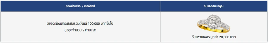 พิเศษ 2 TOP SPENDER REWARD** รับแหวนเพชรมูลค่า 20,000 บาท จำนวน 2 รางวัล สำหรับลูกค้าที่ผ่อนชำระ 0% และมียอดผ่อนชำระสะสมรวมตั้งแต่ 100,000 บาทขึ้นไป สูงสุด จำนวน 2 ท่านแรก รับแหวนเพชร มูลค่า 20,000 บาท **จำกัดจำนวน 2 รางวัล รางวัลละ 1 วง