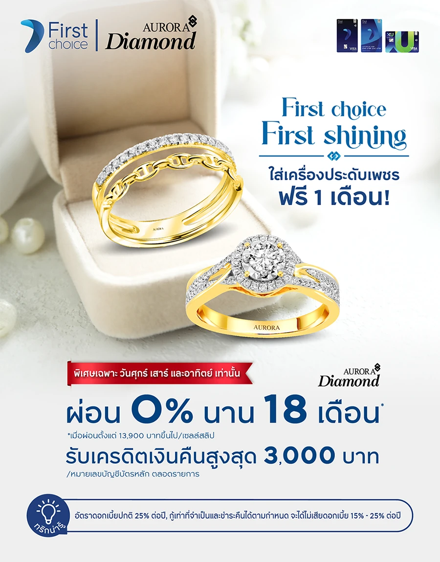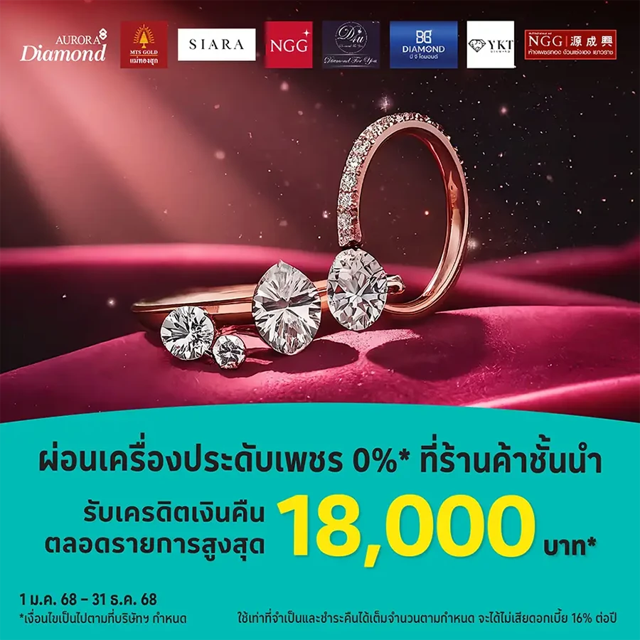 รายละเอียดโปรโมชัน : ผ่อนเครื่องประดับเพชร 0%* นานสูงสุด 10 เดือน ที่ร้านค้าที่ร่วมรายการ รับเครดิตเงินคืนสูงสุด 18,000 บาท*/หมายเลขบัญชีบัตรหลัก ตลอดรายการ