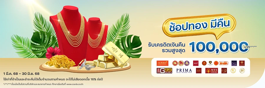- สิทธิพิเศษสำหรับผู้ถือบัตรเครดิตคาร์ดเอกซ์ และบัตรเครดิตไทยพาณิชย์ ยกเว้นบัตรเครดิต CardX FAMILY PLUS / SCB FAMILY PLUS เมื่อชำระทองรูปพรรณ หรือเครื่องประดับเพชร และยอดใช้จ่ายชำระเต็มจำนวน หรือ แบ่งชำระอัตราดอกเบี้ย 0% และอัตราดอกเบี้ยพิเศษสำหรับลูกค้า 0.49% นานสูงสุด 10 เดือน ที่ร้านค้าทองที่ร่วมรายการ ตั้งแต่ 30,000 บาทขึ้นไป / เซลล์สลิป รับสิทธิ์ใช้คะแนนสะสม CardX Rewards ตั้งแต่ 1,000 คะแนนขึ้นไป และสูงสุดไม่เกินยอดใช้จ่าย /เซลล์สลิป แลกรับเครดิตเงินคืน 15% ของคะแนนที่แลก ระหว่างวันที่ 1 มีนาคม 2568 – 30 มิถุนายน 2568