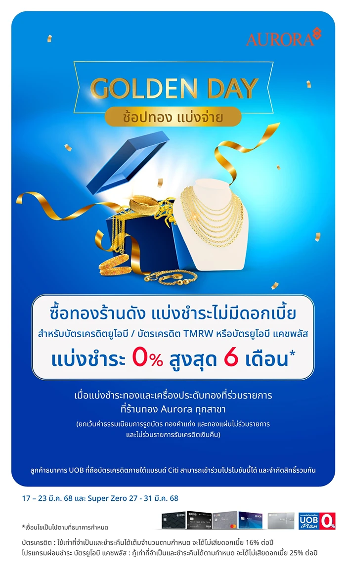 - รายการส่งเสริมการขายนี้ ระหว่างวันที่ 17-23 มี.ค. 68 และ Super Zero 27-31 มี.ค. 68 เฉพาะผู้ถือบัตรเครดิตธนาคารยูโอบี บัตรเครดิต TMRW (ยกเว้นบัตรเครดิตเพื่อธุรกิจ) หรือบัตรยูโอบี แคชพลัส ที่ออกในประเทศไทยเท่านั้น เมื่อแบ่งชำระค่าสินค้าทอง และเครื่องประดับทองที่ร่วมรายการ ผ่านบัตรเครดิตยูโอบี บัตรเครดิต TMRW หรือบัตรยูโอบี แคชพลัส กับห้างทอง Aurora