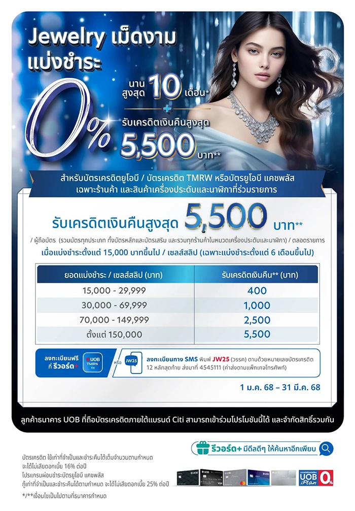 จำกัดการรับเครดิตเงินคืนสูงสุด 5,500 บาท ต่อผู้ถือบัตรเครดิต (รวมบัตรทุกประเภท ทั้งบัตรหลักและบัตรเสริม) หรือบัตรยูโอบี แคชพลัส / รวมทุกร้านค้าในหมวดเครื่องประดับและนาฬิกา ตลอดรายการส่งเสริมการขาย โดยยจะคำนวณยอดเครดิตเงินคืนจากรายการแบ่งชำระ ระหว่างวันที่1 ม.ค. 68 – 31 มี.ค. 68