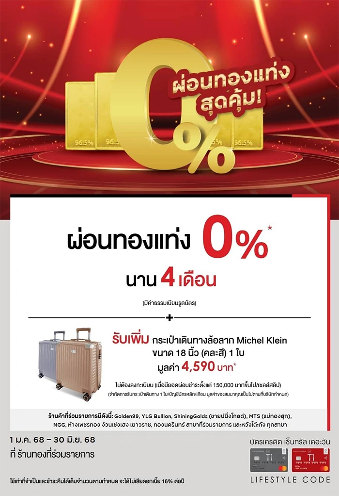 รายละเอียดโปรโมชัน : ผ่อนทองแท่ง 0%* นาน 4 เดือน (มีค่าธรรมเนียมรูดบัตร) รับเพิ่ม กระเป๋าเดินทางล้อลาก Michel Klein ขนาด 18 นิ้ว (คละสี) 1 ใบ มูลค่า 4,590 บาท* ไม่ต้องลงทะเบียน (ยอดตั้งแต่ 150,000 บาทขึ้นไป/เซลล์สลิป)