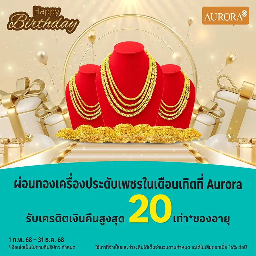 รายละเอียดโปรโมชัน : ผ่อนทองคำหรือเครื่องประดับเพชรที่ ห้างเพชรทองออโรร่า ทุกสาขา รับเครดิตเงินคืนสูงสุด 20 เท่า*ของอายุ เมื่อมียอดผ่อนชำระในเดือนเกิด ตั้งแต่ 15,000 บาทขึ้นไป นาน 10 เดือน