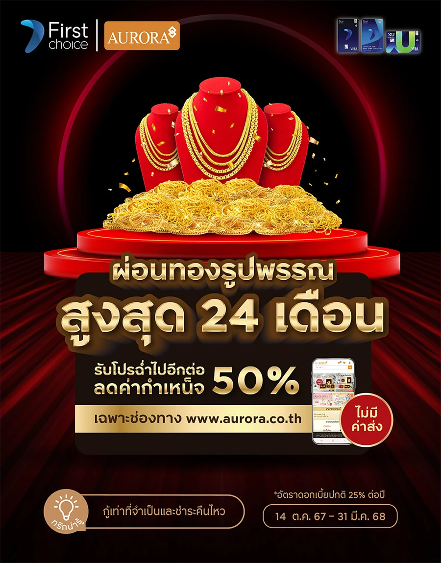 - ห้างเพชรทองออโรร่า แบ่งชำระดอกเบี้ย 0% นาน 6 เดือน วันที่ 18 -19 มกราคม 2568 และ วันที่ 27– 31 มกราคม 2568