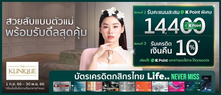 พิเศษที่ 1 รับคะแนน K Point K Point สะสมพิเศษ สูงสุด 14,400 คะแนน* เมื่อชำระเต็มจำนวนผ่านบัตรเครดิตกสิกรไทย ตามเงื่อนไขที่กำหนด