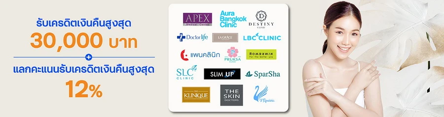 รูดแบบไหนก็ได้ลุ้น ลุ้นรับเครดิตเงินคืน รวมมูลค่า 1 ล้านบาท พิเศษ ผ่อนชำระ 0% นานสูงสุด 10 เดือน พร้อมรับเครดิตเงินคืนไม่จำกัด ณ Cloud Clinic by Doctor Mek