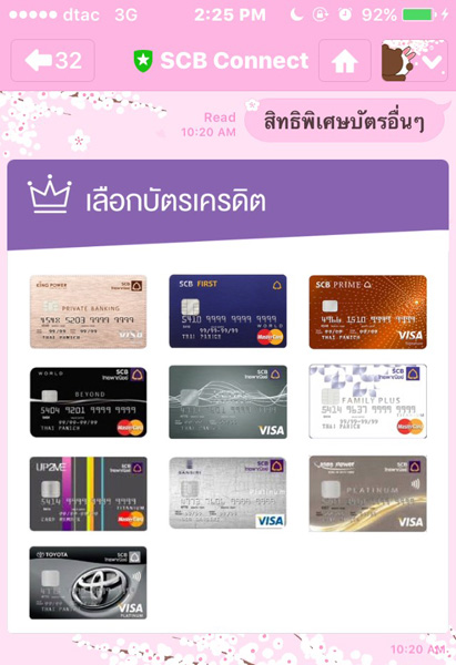 | บริการ | ดูโปรโมชั่นบัตรเครดิต | ทำธุกรรมต่างๆ | ตรวจสอบข้อมูลบัตรเครดิต | ค้นหา SCB ใกล้คุณ |