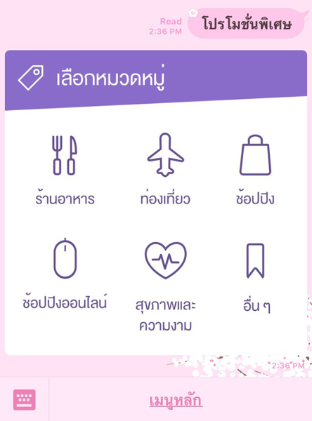 เมื่อกดเลือก "โปรโมชั่นพิเศษ" ระบบจะส่งข้อมูลโปรโมชั่นทั้งหมดของทุกหมวดมาให้ เช่น ร้านอาหาร ท่องเที่ยว ช้อปปิ้ง ฯลฯ ผู้เขียนเลือก ร้านอาหาร ข้อมูลก็จะแสดงตามภาพจากซ้ายไปขวาค่ะ