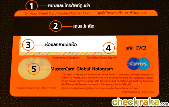 ด้านหลังของตัวบัตรฯ เป็นสีส้มเกือบเข้ม จุดสำคัญ 5 จุด ตรงด้านหลังตัวบัตรนั้นแสดงให้เห็นตามภาพค่ะ