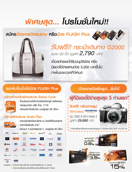 - กระเป๋าเดินทาง G2000 ขนาด 20 นิ้ว มูลค่า 2,790 บาท เมื่อได้รับบัตรได้รับอนุมัติและใช้จ่ายครบ 5,000 บาทขึ้นไป ภายในระยะเวลาที่กำหนด หรือ