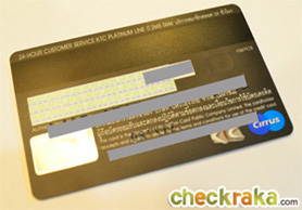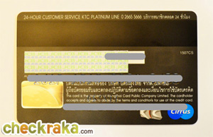 มาถึงด้านหลังตัวบัตรฯ กันบ้าง ซึ่งเป็นสีเดียวกันกับด้านหน้า ไล่จากด้านบนสุดเป็น เบอร์ติดต่อของ Call Center ที่สามารถติดต่อได้ตลอด 24 ช.ม. จากนั้นเป็นแถบแม่เหล็ก พื้นที่สำหรับลายมือชื่อของเจ้าของบัตร และสัญลักษณ์