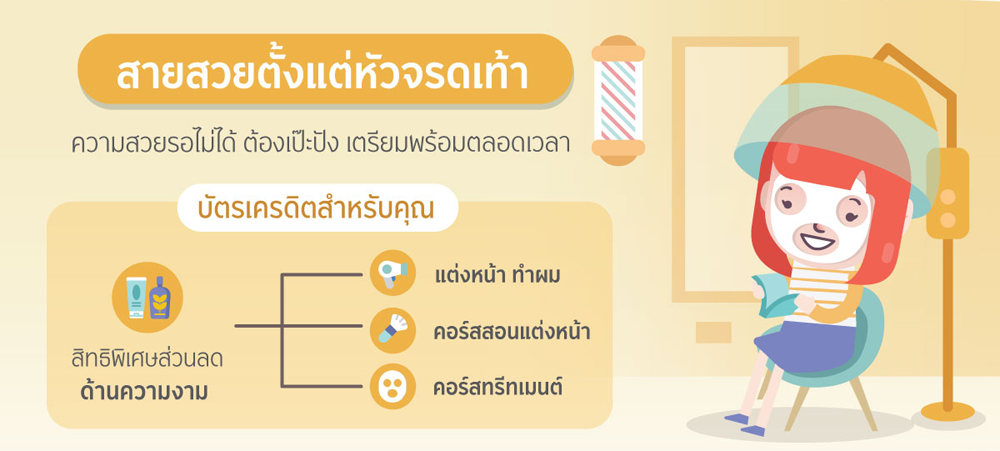 การมีบัตรเครดิตที่ให้สิทธิประโยชน์ในเรื่องความสวยความงามเป็นเรื่องที่ช่วยให้สายสวยเป๊ะ สวยได้ในราคาที่น่าคบ เพราะบัตรเครดิตบางประเภท ช่วยให้คุณได้รับสิทธิพิเศษด้านความงามที่หลากหลาย เช่น ส่วนลดการแต่งหน้า ทำผม คอร์สทรีตเม้นท์ ณ สถานเสริมความงามต่างๆ นอกจากนี้บางบัตรฯ ยังให้สิทธิพิเศษในเดือนเกิด เช่น ได้รับบริการนวดบำรุงผิวหน้าฟรี หรือรับส่วนลดพิเศษสำหรับบริการด้านความงามจากแบรนด์ชั้นนำ หรือแม้กระทั่งการผ่อน 0% เมื่อซื้อคอร์สทรีตเม้นท์อีกด้วย (ดูบทความเพิ่มเติม)