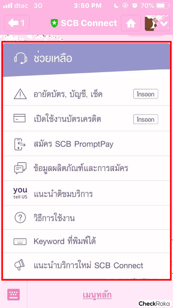 สามารถอายัดบัตร, อายัดบัญชีและ Cheque ได้อย่างรวดเร็ว รวมถึงให้คำแนะนำติชมบริการ นอกจากนั้นยังเป็นช่องทางในการสมัครพร้อมเพย์ และสอบถามข้อมูลผลิตภัณฑ์ต่างๆ ของธนาคารได้อีกด้วย
