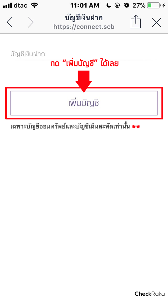 4. กด "เพิ่มบัญชี" ได้เลยค่ะ โดยสามารถเพิ่มได้เฉพาะบัญชีออมทรัพย์และบัญชีเดินสะพัด (กระแสรายวัน) เท่านั้น