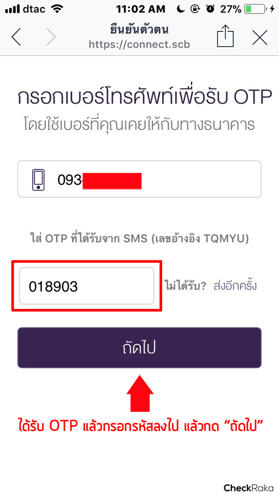 6. เมื่อได้รับรหัส OTP มาแล้ว ใส่รหัสลงไปในช่องว่าง แล้วกด "ถัดไป"