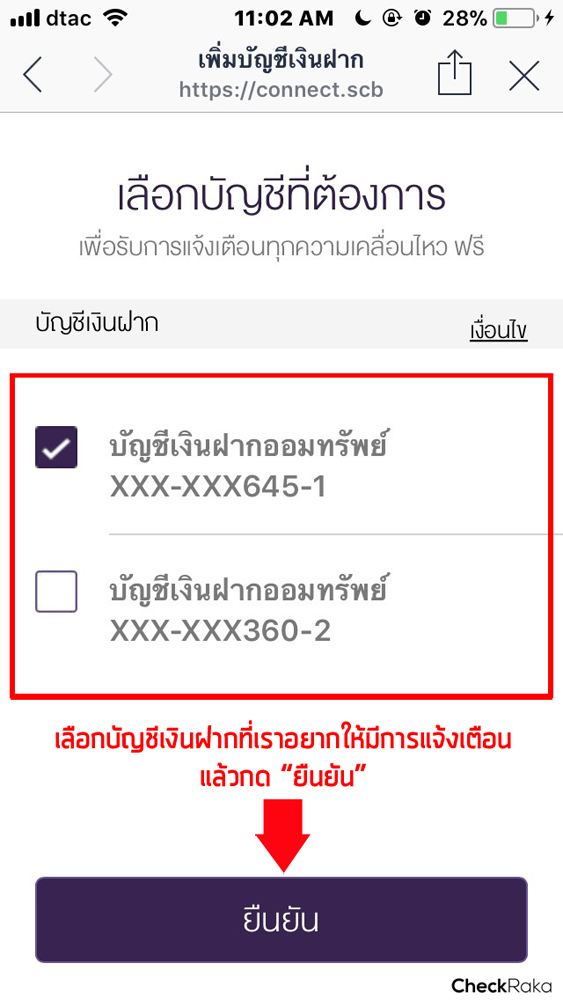 7. ระบบจะแสดงบัญชีเงินฝากทั้งหมดที่เรามี และให้เลือกว่าต้องการรับการแจ้งเตือนของบัญชีไหนบ้าง? เมื่อเลือกบัญชีแล้วก็กด "ยืนยัน"
