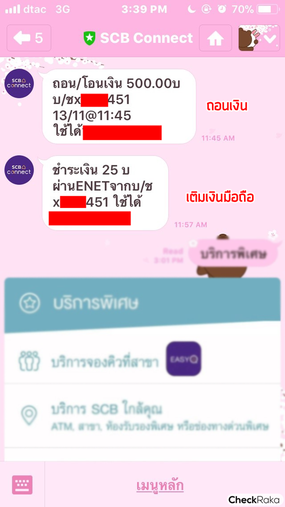 (เมื่อถอนเงิน 500 บาท หรือเติมเงินมือถือเพียง 25 บาท ก็ได้รับการแจ้งเตือนจากระบบที่รวดเร็วมากๆ ค่ะ)
