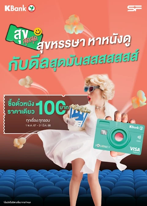 รายละเอียดโปรโมชันสิทธิพิเศษของลูกค้าบัตรเดบิต K-my, K-max, Journey, K-Union Pay แลกซื้อ บัตรชมภาพยนตร์ Deluxe Seat ในราคา 100 บาท (จำนวนสิทธิ์ 24,000 สิทธิ์) ที่โรงภาพยนตร์ในเครือ เอส เอฟ ทุกสาขา