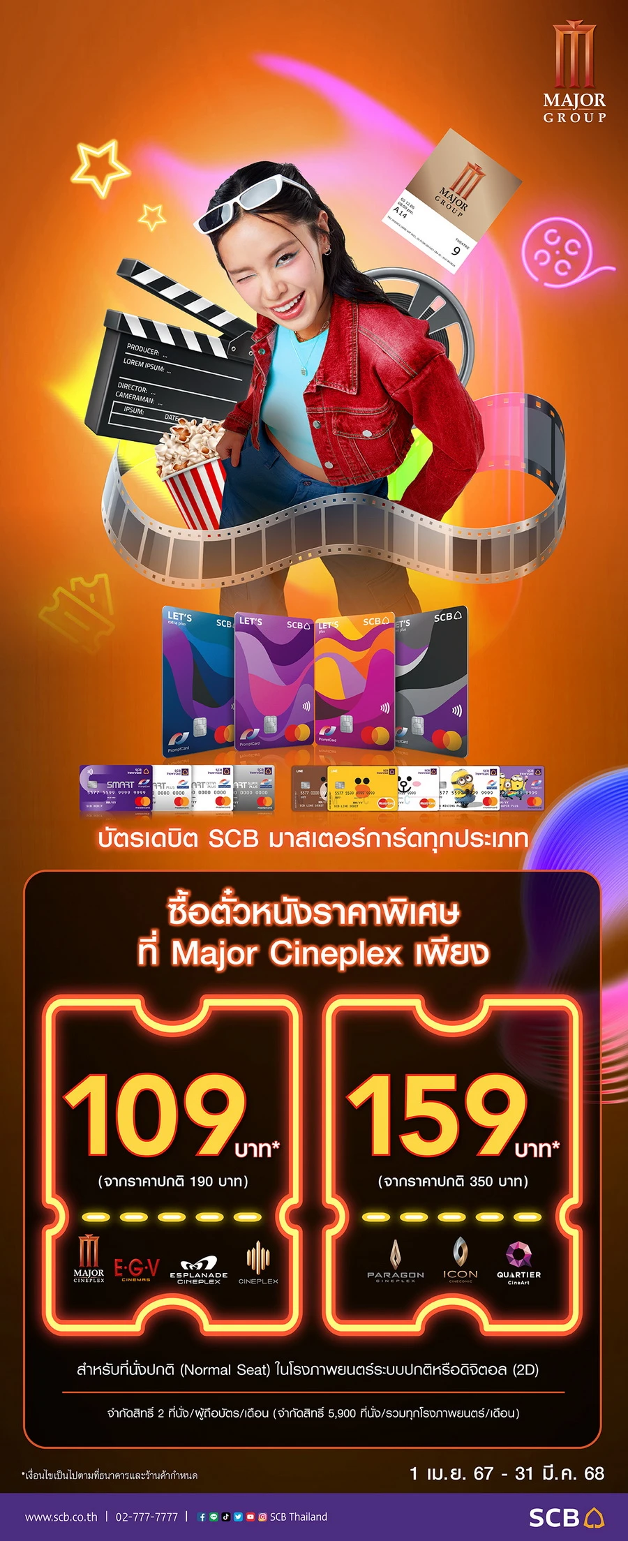 • ผู้ถือบัตรต้องชำระส่วนต่างด้วยบัตรเดบิต SCB มาสเตอร์การ์ด เท่านั้น ผ่านแอป Major Movie Plus หรือเครื่องจำหน่ายตั๋วอัตโนมัติ (E-Ticket)