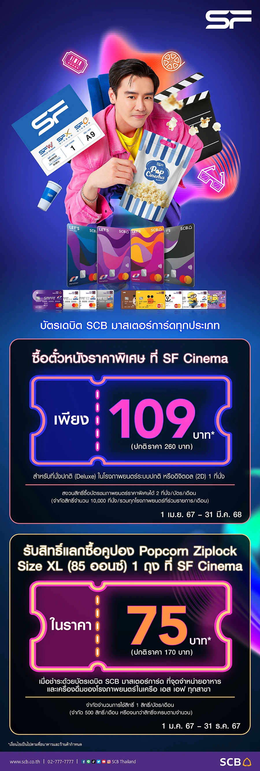 รายละเอียดโปรโมชันSF Cinema x บัตรเดบิต SCB มาสเตอร์การ์ด พิเศษ รับสิทธิซื้อบัตรชมภาพยนตร์ (ที่นั่ง Deluxe) ราคา 109 บาท ที่ SF Cinema และรับสิทธิ์ซื้อ Popcorn Ziplock Size XL ในราคา 75 บาทที่ SF Cinema