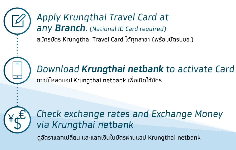 - เดินไปที่ธนาคารกรุงไทยทุกสาขา พร้อมบัตรประชาชน เพื่อสมัครบัตร Krungthai Travel Card
