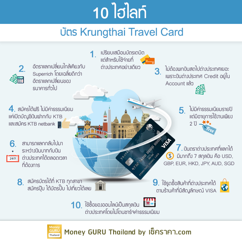 กว่าปีละประมาณ 7 ล้านคน ที่มีไลฟ์สไตล์ชื่นชอบการไปท่องเที่ยวยังต่างประเทศ.. และเพื่อเป็นการตอบสนองนโยบายของรัฐบาล National e-Payment ที่ต้องการจะส่งเสริมให้กระแสสังคมไร้เงินสดเป็นที่แพร่หลาย และไม่จำกัดแค่ในประเทศไทย ธนาคาร กรุงไทย จำกัด (มหาชน) หรือ KTB จึงได้ออกบัตรๆ หนึ่ง ที่จะมาตอบโจทย์ความต้องการที่ว่านั้น ด้วยการออก "บัตร Krungthai Travel Card" บัตรแรก และบัตรเดียวที่สามารถใช้แลกเงินตราต่างประเทศได้ในอัตราพิเศษกว่าในราคาตลาดสูงสุดถึง 7 สกุลเงินด้วยกัน และยังใช้รูดซื้อสินค้าและบริการ ณ ร้านค้าที่มีเครื่องหมาย VISA ได้ทั่วโลก ใช้ถอนเงินสดได้ที่ตู้ ATM ทั่วโลกอีกด้วย สมัครง่ายๆ เพียงมีบัญชีเงินฝากออมทรัพย์ธนาคารกรุงไทย