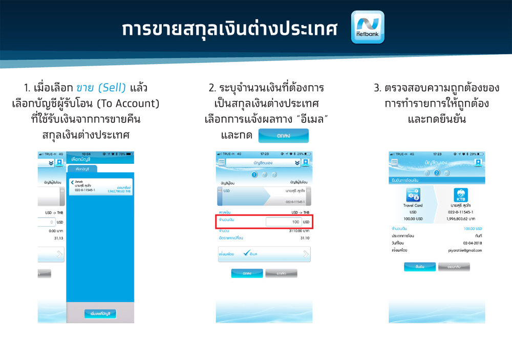 - หากต้องการแลกเงินก็สามารถเช็คอัตราแลกเปลี่ยน และทำการแลกเงินผ่านแอปพลิเคชัน KTB netbank ได้แบบ real time