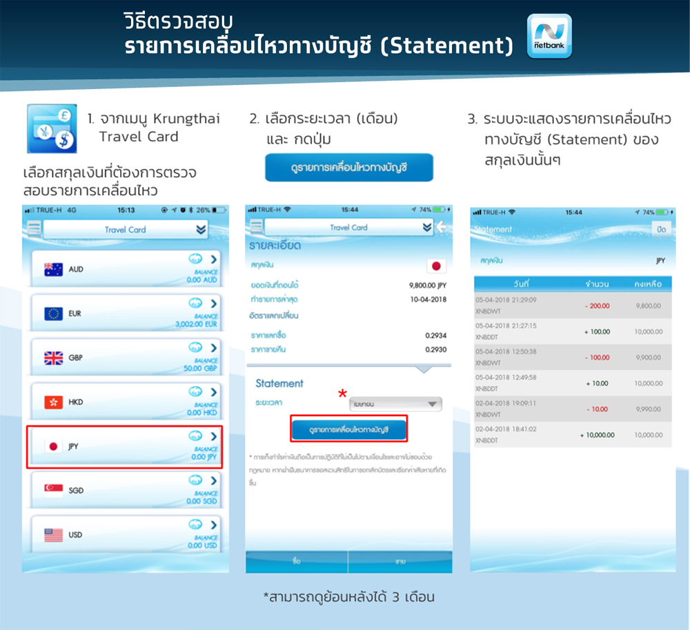 ถ้าต้องการตรวจสอบรายการเคลื่อนไหวทางบัญชี หรือ Statement ก็สามารถทำได้ย้อนหลัง 3 เดือน โดยมีขั้นตอนการใช้งาน ดังนี้