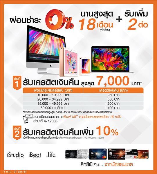ผ่อนชำระสินค้า 0% นานสูงสุด 18 เดือน (ทั้งร้าน) พร้อมรับสิทธิพิเศษเพิ่ม 2 ต่อ