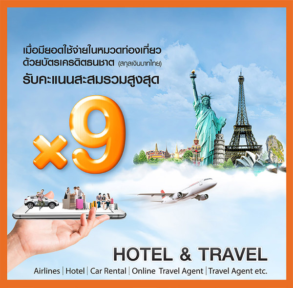 รับคะแนนสะสมรวมสูงสุด x9 เมื่อใช้จ่ายผ่านบัตรเครดิตธนชาต (เป็นสกุลเงินบาทไทย) ในหมวดท่องเที่ยว