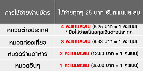 ทุกการใช้จ่ายปกติในหมวดทั่วไป 25 บาท จะได้รับคะแนนสะสม T-Rewards 1 คะแนน (25 บาท = 1 คะแนน) และจะได้ รับคะแนนสะสมสูงสุด 4 เท่า เมื่อใช้จ่ายเป็นสกุลเงินต่างประเทศ ไล่ระดับลงมาเรื่อยๆ ตามหมวดที่แสดงในตาราง ซึ่งก็ถือว่าเป็นการให้คะแนนสะสมที่อยู่ในระดับดีมากอีกหนึ่งบัตร และคงเป็นที่ถูกใจสำหรับสายสะสมคะแนนที่ชอบเที่ยวไปต่างประเทศมากๆ เลยค่ะ