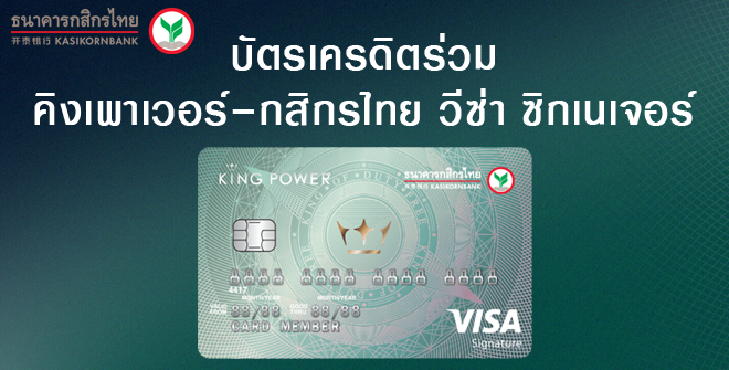 บัตรเครดิตร่วม คิงเพาเวอร์ - กสิกรไทย Signature รับสิทธิพิเศษที่มากกว่า ส่วนลดสูงสุด 20% ตั้งแต่บาทแรก เมื่อช้อปสินค้าที่ คิง เพาเวอร์ ทุกสาขา รับคะแนนสะสม KBank Reward Point เพิ่มพิเศษ X2 พร้อมรับสิทธิพิเศษเหนือระดับอื่นๆ อีกมากมาย