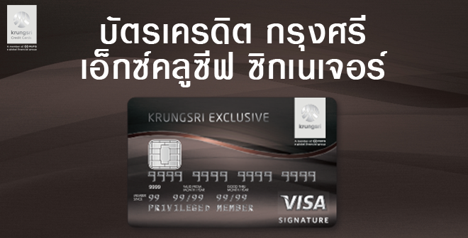 บริษัท บัตรกรุงศรีอยุธยา จำกัด หรือ Krungsri อีกหนึ่งเจ้าของบัตรเครดิตที่มีบัตรสุดเอ็กซ์คลูซีฟสมชื่อ นั่นก็คือ บัตรเครดิต กรุงศรี เอ็กซ์คลูซีฟ ซิกเนเจอร์ (Krungsri Exclusive Signature Credit Card) เอกสิทธิ์ความสุขเหนือระดับในการใช้ชีวิต ไม่ว่าจะเป็นการเดินทาง การรับประทานอาหาร การแลกคะแนนเพื่อโอนเป็นไมล์สะสม ความบันเทิง และสิทธิพิเศษอื่นๆ อีกมากมาย